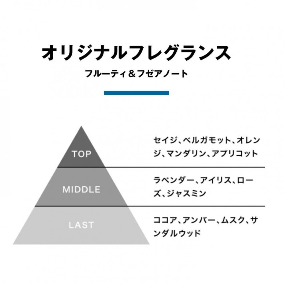 【TOP】セイジ、ベルガモット、オレンジ、マンダリン、アプリコット【MIDDLE】ラベンダー、アイリス、ローズ、ジャスミン【LAST】ココア、アンバー、ムスク、サンダルウッド